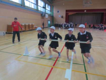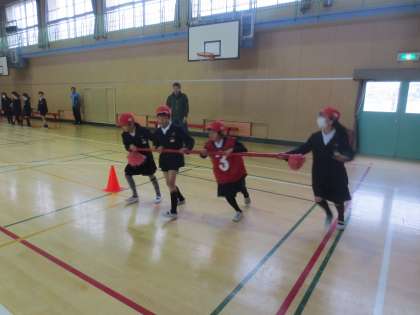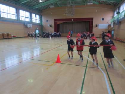 3年生と5年生が協力して「台風の目」の競技をしました。とても仲よく協力して競技を楽しんでいました。
