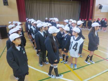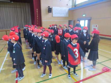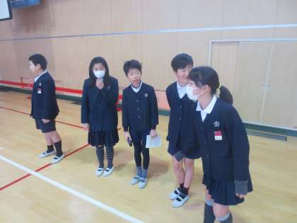 2/23(木)朝の児童集会です。集会委員会の児童が、ペアで競技をすることを説明していました。