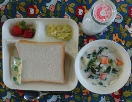 ほうれん草のクリームシチュー、キャベツのサラだ、いちご、食パン、マーガリン、牛乳