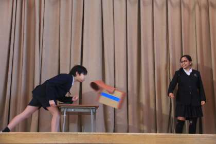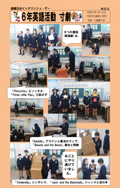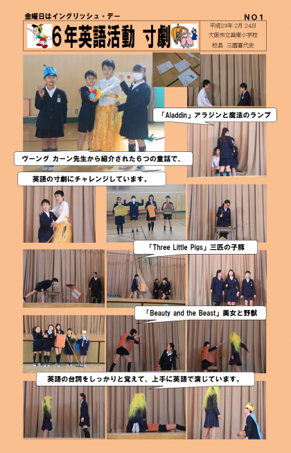 2/24(金)6年生が英語劇の発表会(後半)をしました。3週間前にヴーング カーン先生から6つの童話が紹介され、その中から自分たちで選び、自分たちで英語劇を練習して発表できるようにしました。6年生の児童はチャレンジしまし、みごとにやり遂げていました。英語劇の発表会の後半は、来週の金曜日にいたします。