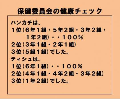 ハンカチ・ティッシュをもってきているかの健康チェックを、始業前に保健委員会の児童がしました。そして、学級ごとに調べて、2/28(火)昼休みに健康チェック度を保健委員会の児童が発表しました。ハンカチは、1位(6年1組・5年2組・3年2組・1年2組)、2位(3年1組・2年1組)、3位(5組1組)でした。ティシュは、1位(6年1組)、2位(4年1組・4年2組・3年2組)、3位(1年2組)でした。100%の学級もありました。ハンカチ・ティッシュは自分で用意ができます。毎朝、気づいてくださいね。