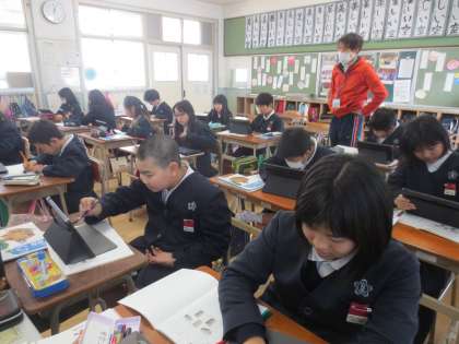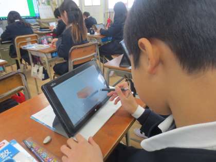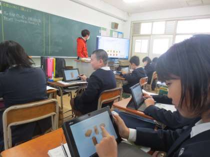 子どもたちは、タブレット画面で立体を傾けたり回転したりして条件に合う仲間を調べています。