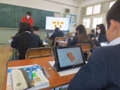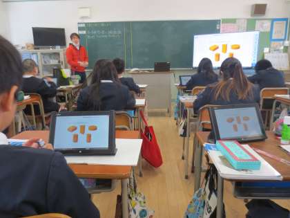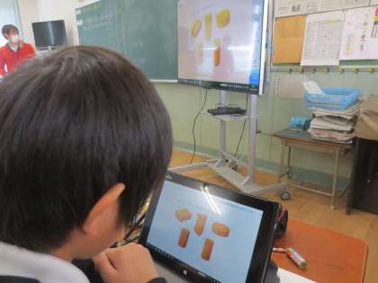 指導者の大型TVとつながっているタブレットを操作して5つの立体を調べています。
