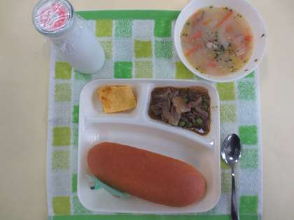 牛肉のデミグラスソース煮、コーンスープ、かぼちゃのプリン、コッペパン、りんごジャム、牛乳