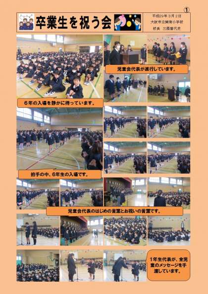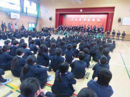 1年生〜5年生の在校生が、卒業していく6年生に、心温まる歌と感謝のメッセージを伝えました。また、在校生から6年生にプレゼントをわたしました。詳しくは右記の配布文書に載せています。