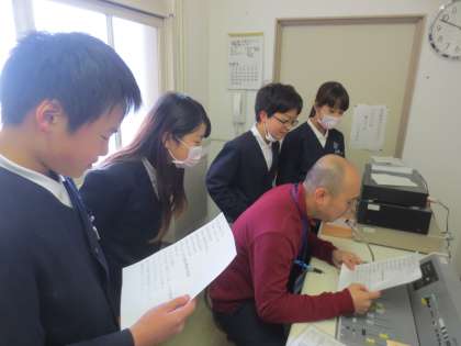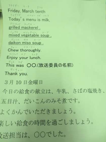 毎週金曜日、給食の時間に英語で献立を紹介します。まず放送委員会の児童が英語で・・・そのあと、英語のカーン先生が同じ献立を英語で紹介します。