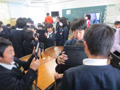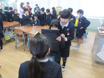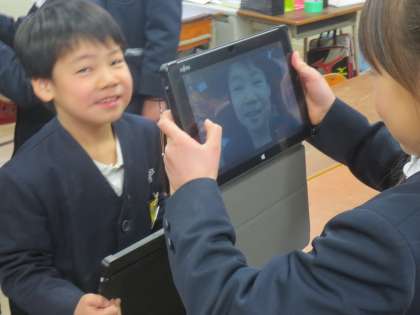 カメラ機能の使い方を教えてもらい、教室のいろいろなものを撮影し保存していました。マナーとして「撮ってもいいですか」とたずねてから撮影していました。2年生はタブレットPCにとても興味をもったようです。