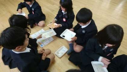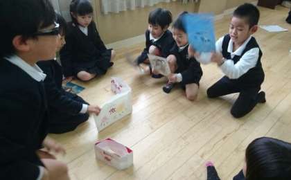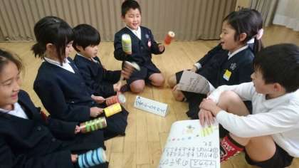 他にも、トレーを使った「ビー玉ころがし」、画用紙でつくったカニを下敷きで仰いでゴールをめざす「カニレース」、2年生が歌う曲に合わせて、あきかんで使ったマラカスを振る「空きかんマラカス」のコーナーがありました。