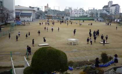雪が舞うような寒い日。それでも、子ども達は元気いっぱい。たくさんの子ども達が運動場で遊びます。