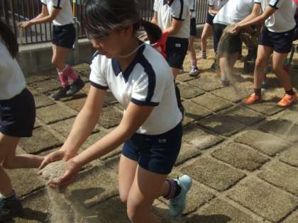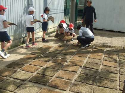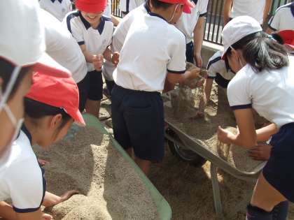 芝の植え付けたあとは、砂をまいていきます。バケツや一輪車で力を合わせて砂を運んでくれました。