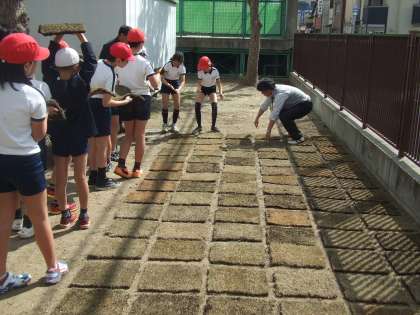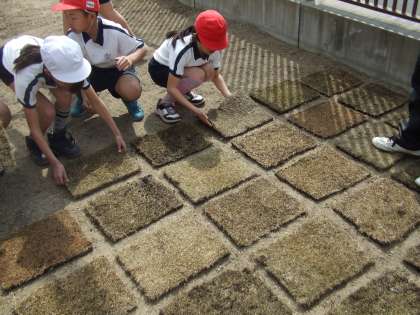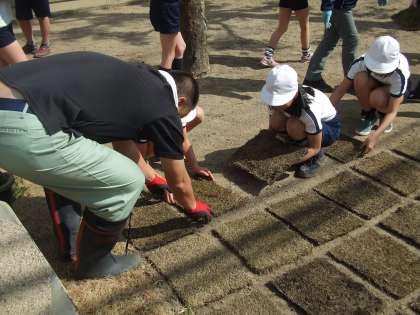 3月に入り40束の高麗芝が送られてきましたので、今回は地域の方々をお呼びせず、4年生児童だけで芝の植え付けをしました。3/17(金)