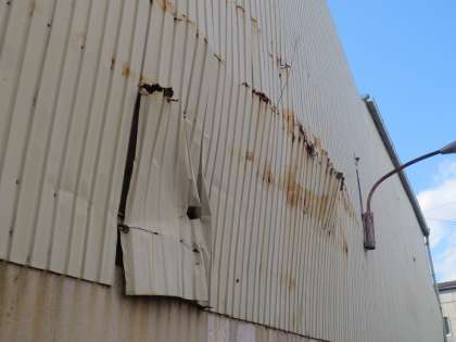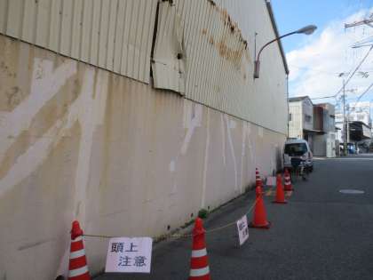 「校区の巽南2−3−2付近に稼働していない工場があり、囲っているトタン壁の一部が落下することもあるので、赤コーンで入らないようにしています。近づかないようにして下さい。」