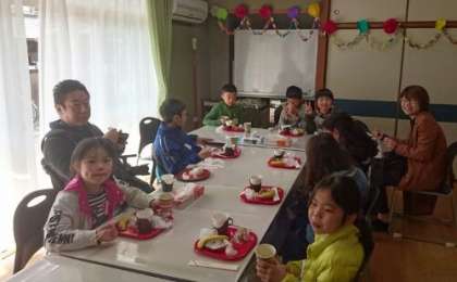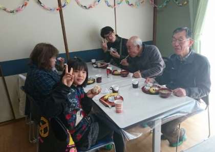 集まった子どもたちも、作っていただいたおにぎりやウィンナー、みそ汁を食べていたときは、笑顔でいっぱいでした。「とてもおいかったです。ありがとうございました。」