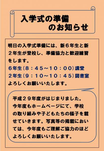 明日の入学式準備には、新6年生と新2年生が登校し、準備協力と歓迎練習をします。6年生(8:45〜10:00)講堂 2年生(9:10〜10:45)図書室 よろしくお願いいたします。