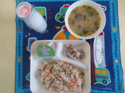 鶏ごぼうご飯、みそ汁、焼きれんこん、ぶどうゼリー(特配)、牛乳