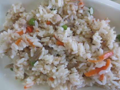 鶏挽肉、こんにゃく、ごぼう、にんじん、グリンピースの入った混ぜご飯です。