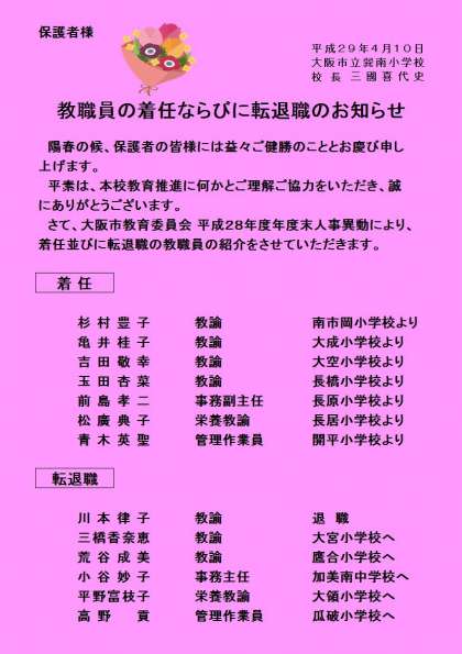 昨年度末、子どもたちとの別れを大切にと、修了式後に教職員の離任式をいたしました。年度が替わり、あらためて着任ならびに転退職のお知らせをいたします。