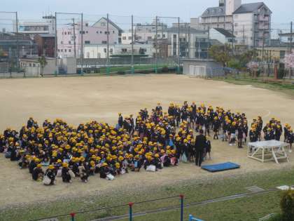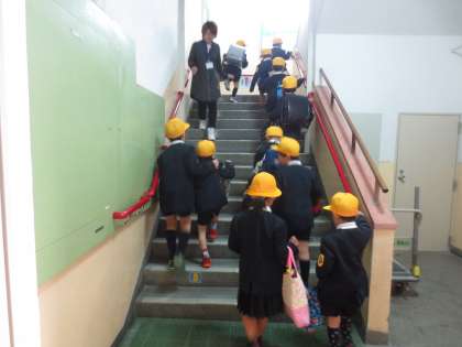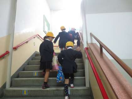新1年生の教室では担任の先生がまっています。新2年生〜新6年生は上野先生の指示で講堂に移動しています。