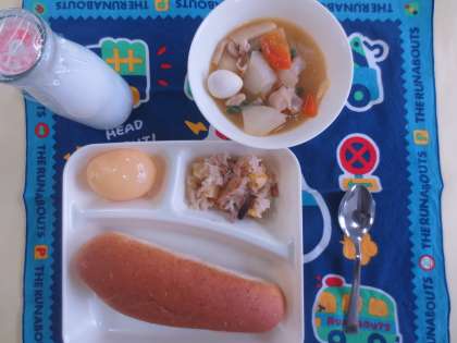 鶏肉とうずら卵のうま煮、中華おこわ、白桃(缶)、ごまパン、牛乳