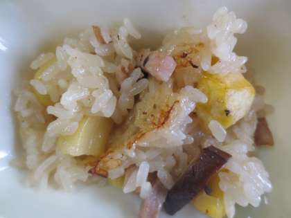もち米に焼き豚、くり、しいたけを入れて焼き物機で作ります。子ども達に人気のおこわです。