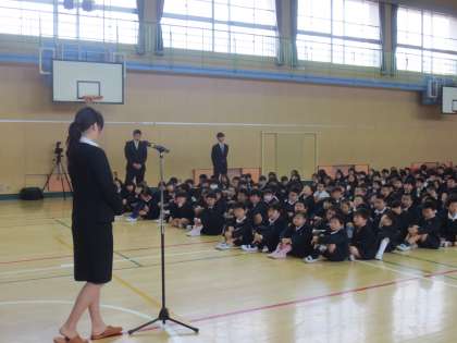 保健の先生として教育実習に来られた新井梨花先生を紹介しました。保健室の桂先生の指導のもとで、4/17(月)〜5/10(水)まで教育実習をします。どの学年の児童もお世話になります。