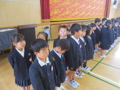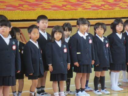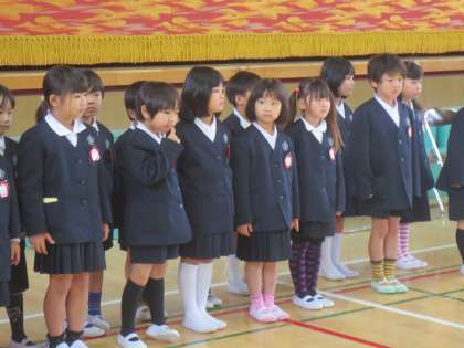 しっかりと整列してお姉さん、お兄さんの出迎えのことばをきいていました。