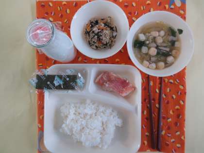 赤魚のレモンじょうゆかけ、五目汁、高野どうふのいり煮、焼きのり(特配)、ご飯、牛乳