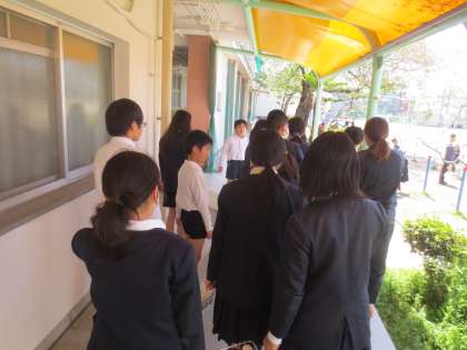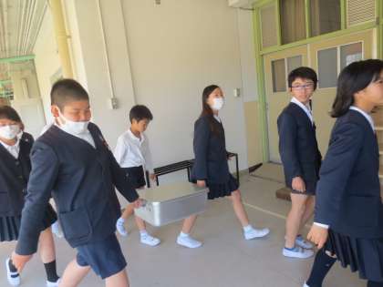 4/19(木)6年生が給食室から牛乳や食器など運び、1年生の教室までとどけています。