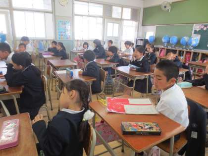 縦割り班の顔合わせと班長・副班長の紹介をしています。また、一人ひとりが自己紹介もしたようです。
