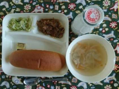 豚肉のデミグラスソース、スープ、キャベツとピーマンのソテー、牛乳