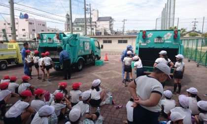 2時間目は、体育館横でパッカー車とごみの回収につて説明がありました。4種類の曲を流して、回収するごみの種類を知らせているそうです。まだまだたくさんのことが、「パッカー車のひみつ」がありました。
