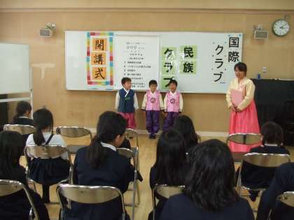 その国際クラブ、1年生を3人迎えて総勢18人でスタートしました。今日は、新しく来た金ソンセンニムのもと、開講式が行われました。