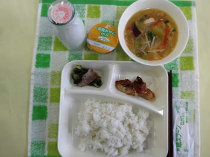 鶏肉のしょうゆマヨネーズ焼き、みそ汁、おおさかしろなの煮びたし、ご飯、牛乳