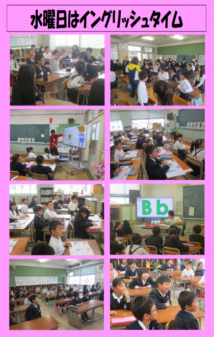 4/26(水)から1〜6年(全校)の「イングリッシュタイム」がはじまりました。毎週水曜日の朝、15分間の英語活動に取り組みます。「イングリッシュタイム」では、英語で歌い、英語でゲームなどをして、楽しく英語にふれる機会にします。手遊びABC SONG
