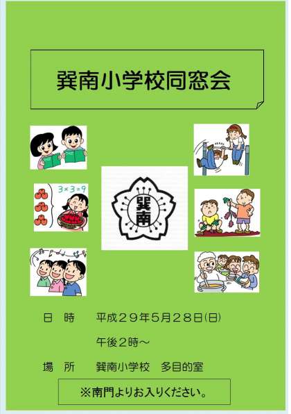 左記カテゴリにある「同窓会」に、平成29年5月28日(日)午後2時から開催される巽南同窓会の案内を載せています。今回は、「平成6年4月〜平成9年3月生まれ」の方の小学校卒業時に書いたメモリー(タイムカプセル)を開けます。先生方も来られます。対象の卒業生の方は多数ご参加下さい。