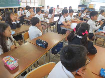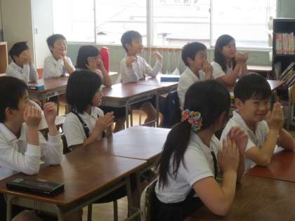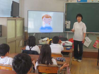 1〜6年(全校)「イングリッシュタイム」です。毎週水曜日の朝、15分間の英語活動に取り組みます。「イングリッシュタイム」では、英語で歌い、英語でゲームなどをして、楽しく英語にふれる機会にします。手遊びABC SONG