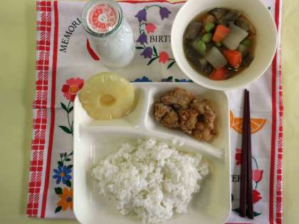 鶏肉のたつたあげ、あつあげと干しずいきの煮もの、パインアップル(缶)、ご飯、牛乳