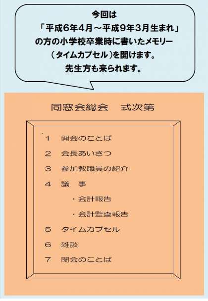 左記カテゴリにある「同窓会」に、平成29年5月28日(日)午後2時から開催される巽南小学校同窓会のご案内を載せています。今回は、「平成6年4月〜平成9年3月生まれ」の方の小学校卒業時に書いたメモリー(タイムカプセル)を開けます。先生方も来られます。対象の卒業生の方は多数ご参加下さい。