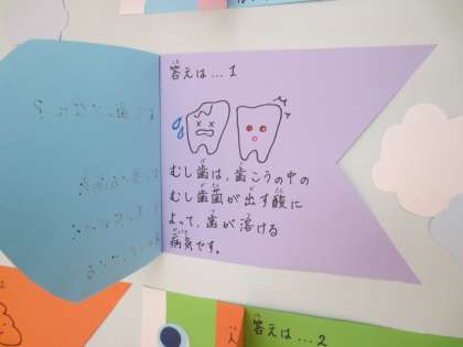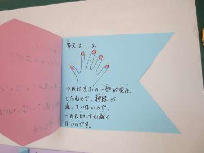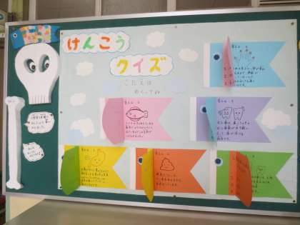 保健室の前に「けんこうクイズ」が掲示されていました。歯のこと、爪のこと、うんこのこと、お腹がグーグーの音のことなど、クイズになっています。答えを載せちゃいましたが・・・チャレンジしてみて下さい。