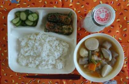 ちくわのいそべあげ、鶏肉とじゃがいもの煮もの、あっさりきゅうり、ご飯、牛乳