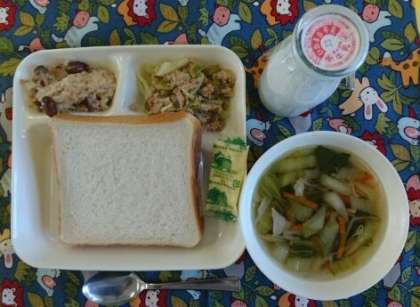金時豆の中華おこわ、中華スープ、ツナと野菜のオイスターソースいため、食パン、ソフトマーガリン、牛乳