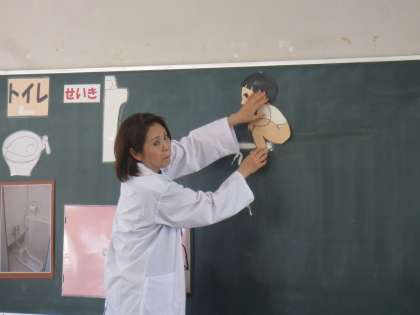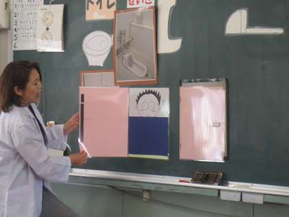 「うんこ」「おしっこ」の仕方、トイレで気をつけることなど、子どもたちは目を輝かせてしっかりとお話を聞いていました。