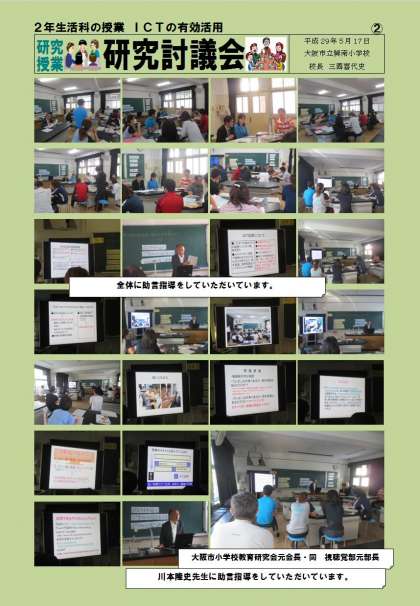5/17(水)2年1組(生活科)の公開授業(研究授業)後、教員による研究討議会を実施し、成果・課題・質問等の意見を交流し授業を検証しています。また、外部講師の方に指導をいただき、各教員が授業力を高める機会にしています。指導助言には、川本隆史先生(大阪市小学校教育研究会元会長・視聴覚部元部長)にしていただきました。ありがとうございました。