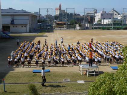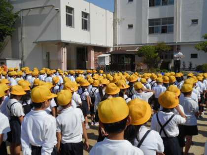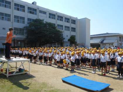 朝から気温が高く汗を流しながらの全校朝会でしが、子どもたちはきちんと整列し、お話を集中して聞いていました。新田先生から生活目標とルールを守ることの大切さについてのお話がありました。