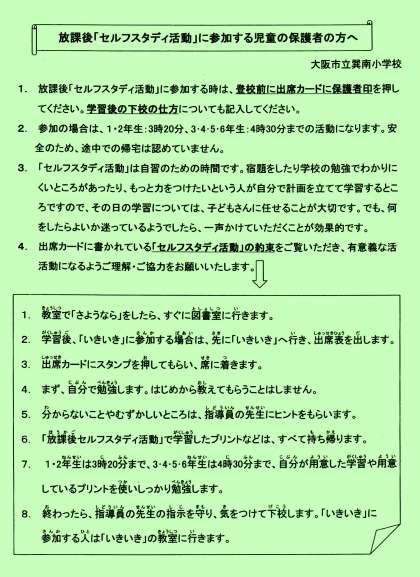 セルフスタディーは、学校の放課後の時間帯を利用して、子どもたちに自主学習の機会にしています。2〜6年生が対象です。6月から開始いたしますが、今後の申し込みも可能です。子どもさんとご相談下さい。