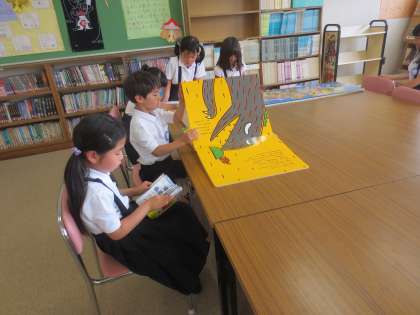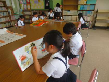 5/23火曜日は図書委員会の児童が開放しています。担当の眞田先生と図書の整理や貸し出をしています。