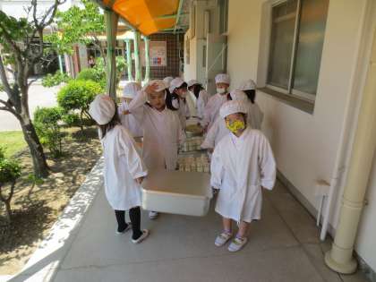 5/24(水)の給食当番の様子です。最初、1年生にとって「おかず」「食器」「牛乳」「ごはん」などを運ぶのは、とても重く大変な当番活動でした。でも、1年生の子どもたちは、回数を重ねるごとに上手に運べるようになってきました。とてもしっかりしています。