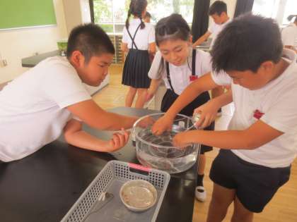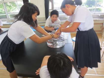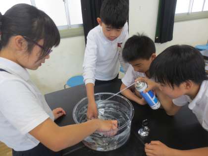 水の中で酸素を集めています。水の減りで酸素が確認できる水上置換法で集めています。