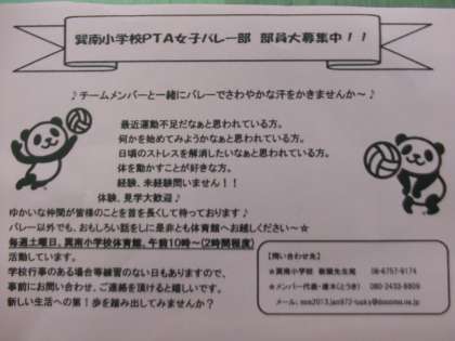 6月3日の土曜参観の時、授業が始まる前に、女子バレー部の方が部員募集のチラシを配っていました。現在部員は9人で、人数がギリギリなのだそうです。
