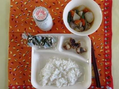 たこのてんぷら、豚肉とさといもの煮もの、焼きのり、ご飯、牛乳